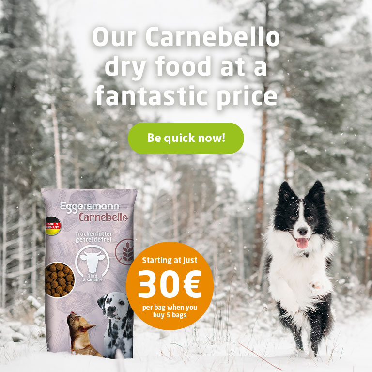 With Eggersmann Carnebello we present our dog food since February 2022 - wet food, dry food and natural snacks offer, among others, variants for sensitive dogs, large breeds or for grain-free nutrition.