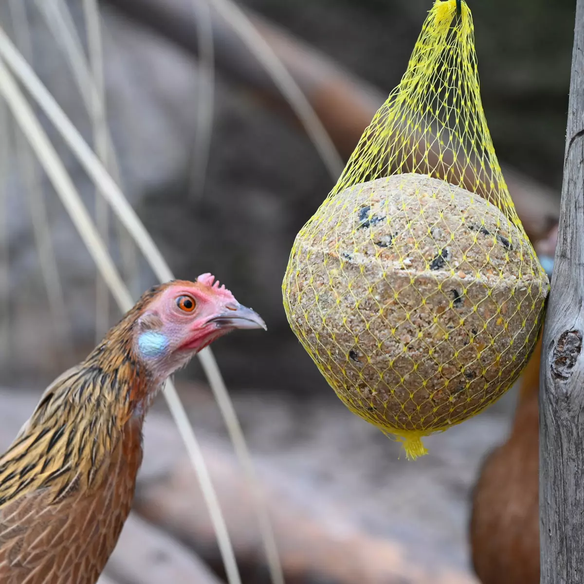 Our Chicken-Ball XXL are GMO-free feed balls that encourage playful activity among your flock. The best plant-based ingredients, such as sunflower seeds, maize and peanuts, have been combined to make a palatable blend that provides your chickens with vital plant-based nutrients. Our Chicken-Ball XXL are available with and without nets so that they can be hung in the coop or placed on the ground. The round shape and rolling motion of these feed balls satisfy the natural pecking instinct of your chickens while engaging them in play.