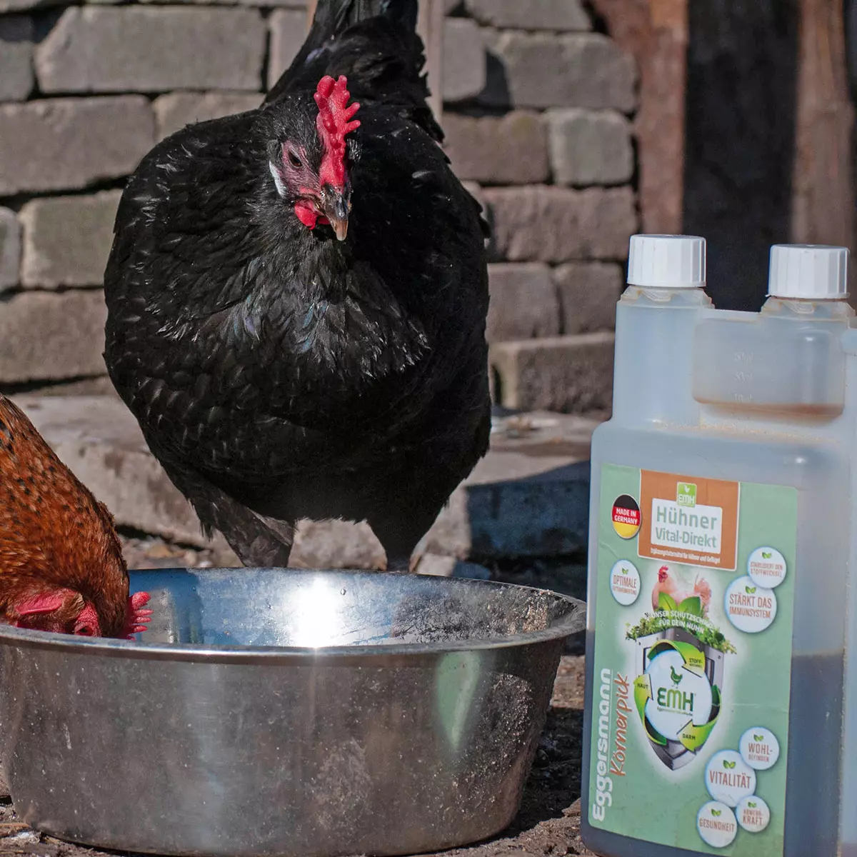 EMH Chicken Vitality-Direct is a liquid concentrate that naturally promotes the immune system and intestinal flora of your chickens. Stress and other strain such as disease can destroy and change intestinal flora. Bacteria, which produce fermenting and acidic substances as they metabolise, thrive here. Different decomposition products can have a very adverse impact on the entire metabolism, leading to an impaired immune system. The regular use of EMH Chicken Vitality-Direct improves the bioavailability of the nutrients and active ingredients provided. The fermented plant extract from highly effective herbs naturally supports the metabolic processes and restores equilibrium.