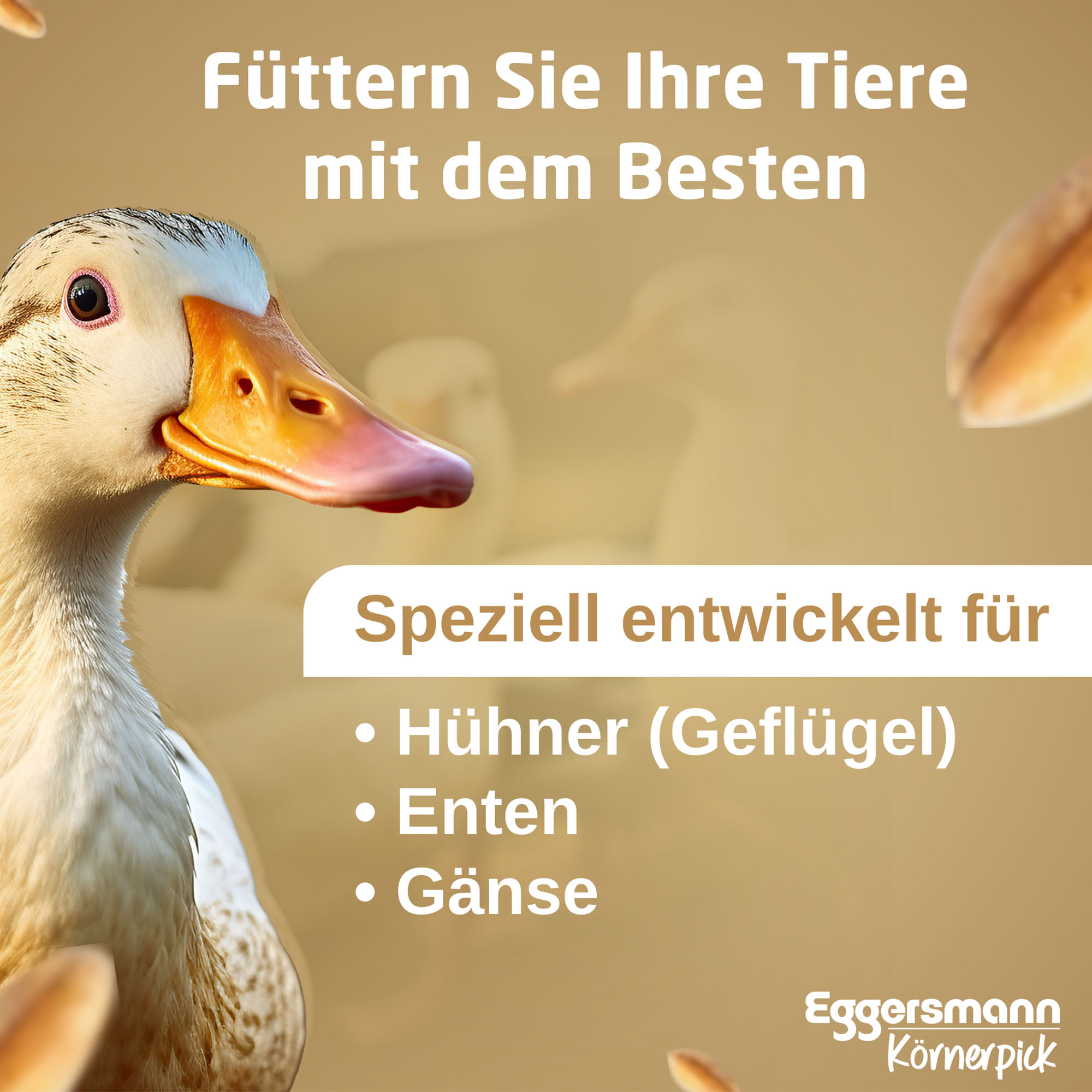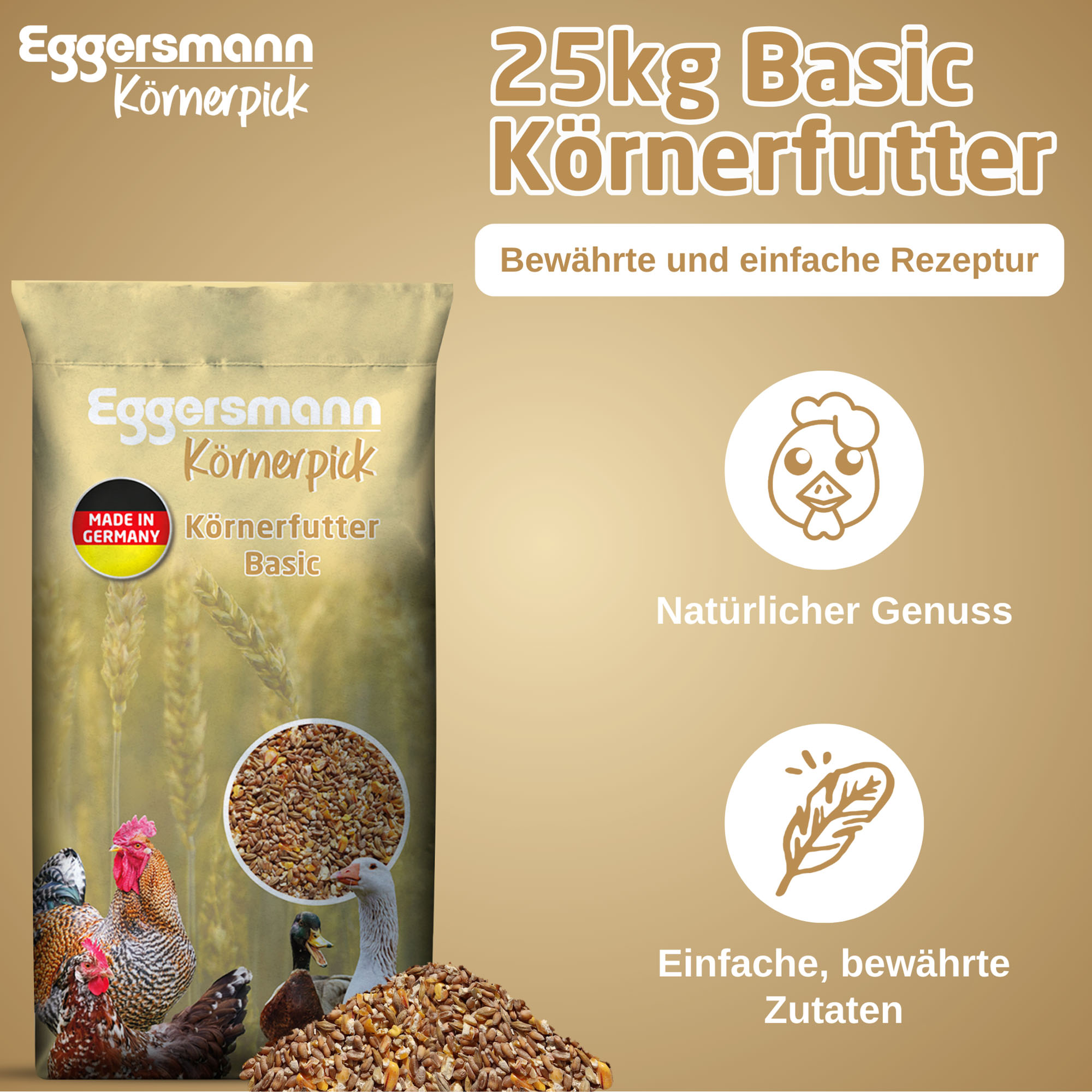 Tasty basic feed, GMO-free · suitable for many poultry species, such as chicken, geese and ducks