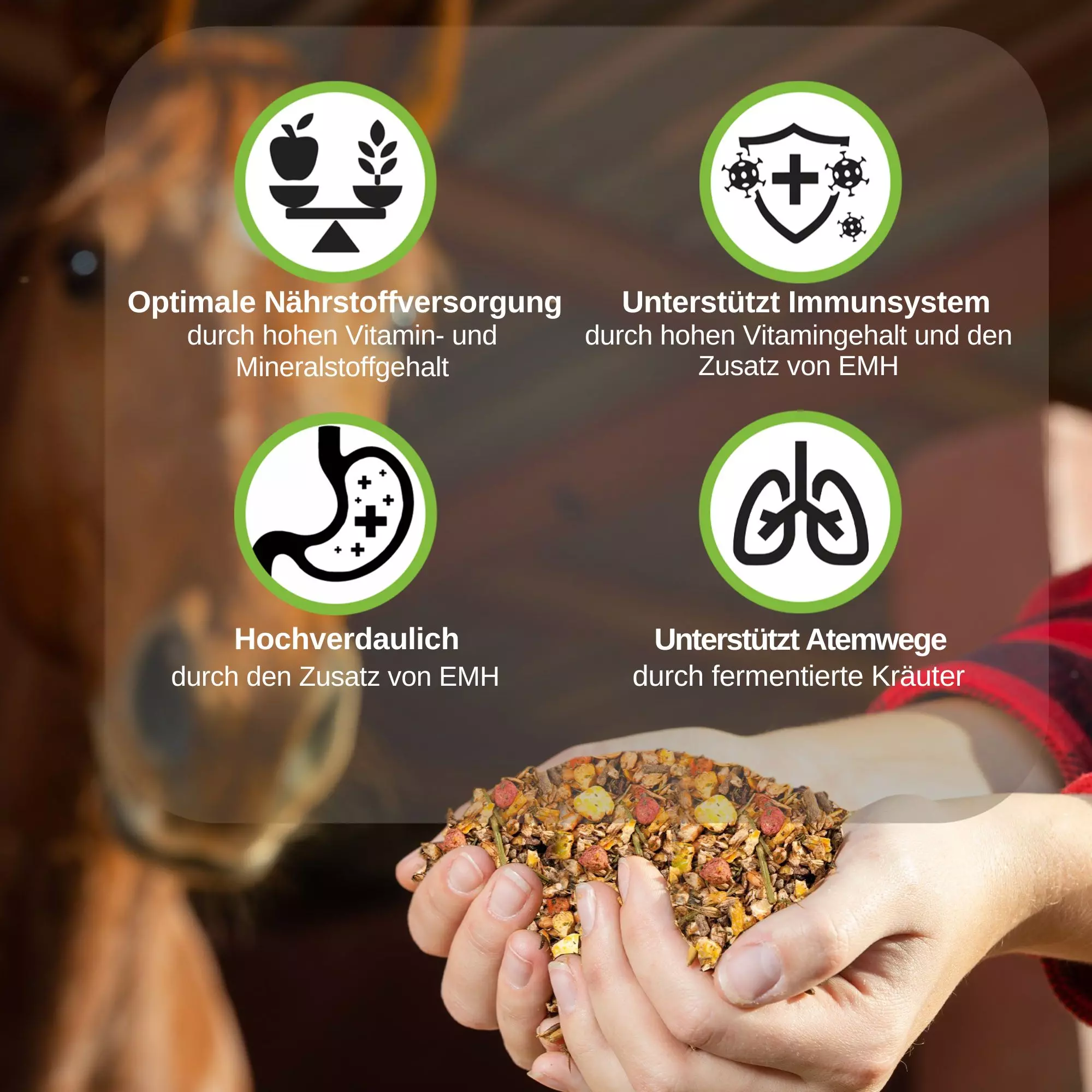 EMH is an extract from highly effective herbs, fermented by micro-organisms, which naturally supports the metabolic processes and strengthens the immune system. With the fermentation process, the natural active substances of these herbs are more accessible for the horse and, therefore, more effective than the same herbs in dried form.