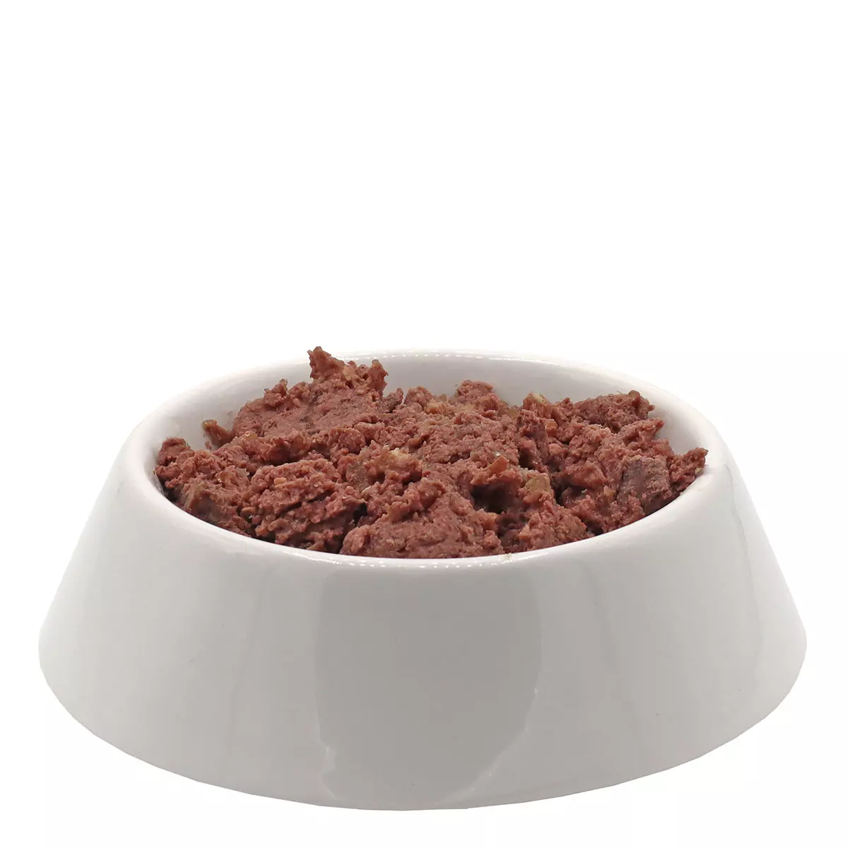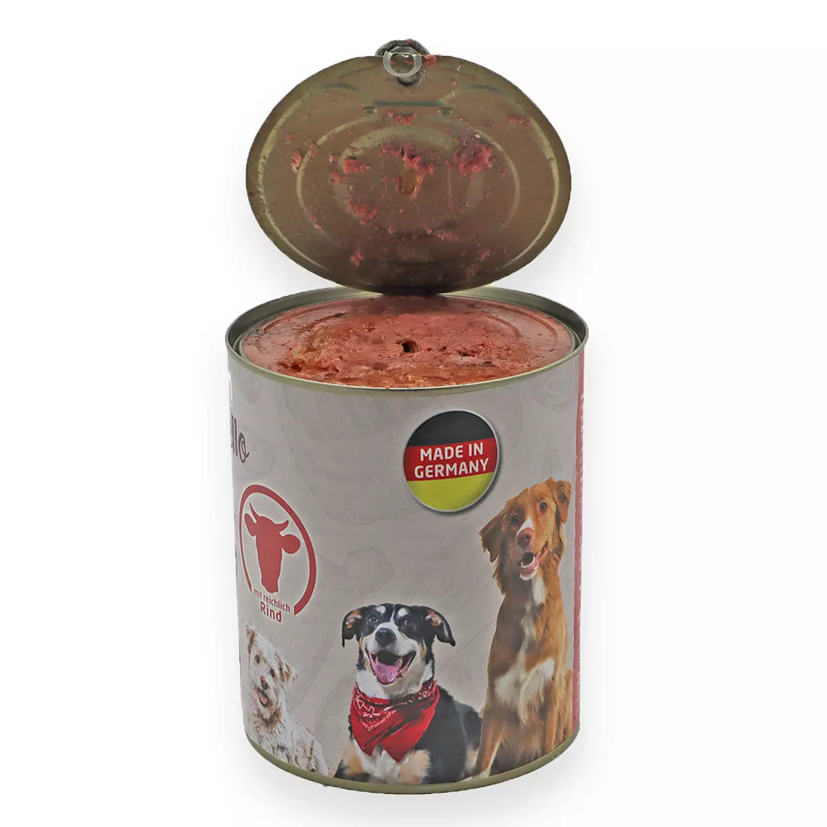 Our Eggersmann Carnebello with Beef is an appetising canned dog food with a high energy content, making it particularly popular among active dogs. The succulent muscle meat gives it a firm, meaty texture that dogs love. Combining a high amount of premium-quality, easily digestible beef with salmon oil and omega-3 fatty acids, it provides your dog with all the nutrients it needs. Because of the particularly gentle cooking process, all important vitamins and minerals are retained in this complete dog food. As it is completely free from grains, sugar, artificial colours and flavours, our canned dog food provides your dog with both a tasty and nutritious meal. Our Eggersmann Carnebello with Beef is suitable as a complete food for adult dogs but can also be mixed with dry food if preferred.