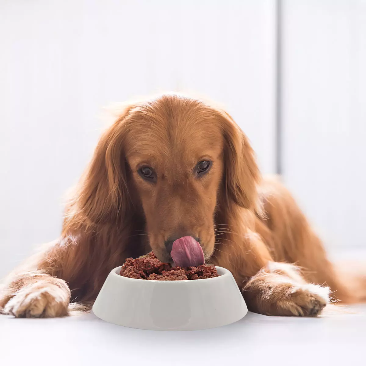 Our Eggersmann Carnebello with Venison is a high-quality wet dog food for canine connoisseurs. The high amount of premium-quality venison meat gives it a firm, meaty texture. It is packed with nutrients as well as being low in fat. The juicy muscle meat, combined with salmon oil and valuable omega-3 fatty acids provides your dog with all the nutrients it needs. Because of the particularly gentle cooking process, all the important vitamins, trace elements and minerals are retained in this complete dog food. As it is completely free from grains, sugar and artificial colours and flavours, our wet dog food provides your dog with both a tasty and nutritious meal. Our Eggersmann Carnebello with Venison is suitable as a complete feed for adult dogs but can also be mixed with dry feed if preferred.