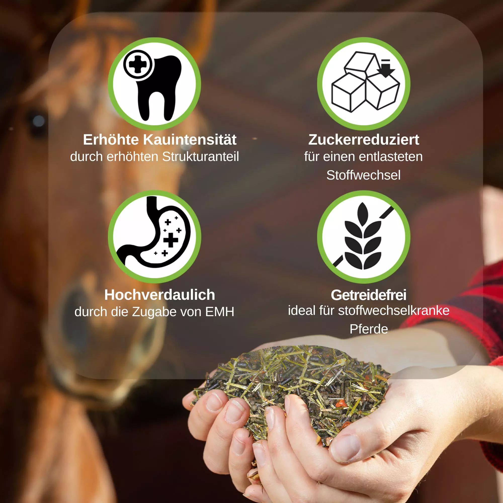 Structure Grain Free with highly digestible, intact crude fibre is designed for feeding metabolically compromised or sensitive horses. Due to the low starch and sugar content, it relieves the body's own metabolic processes; the high raw fibre content promotes a harmonious colonic flora. Sunflower seeds and rice husk bran provide essential fatty acids. Alfalfa is characterised by high-quality protein and is therefore ideal to provide the body with amino acids and support muscle growth. Tasty apple pomace provides highly valuable pectins. Structure Grain Free can contribute significantly to a better quality of life of your horse due to its natural ingredients. Thanks to the addition of EMH, digestion