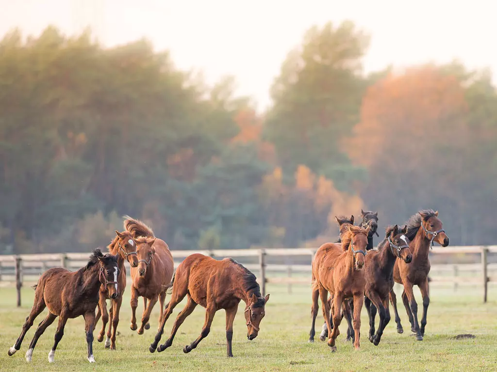 Jährlinge kommen, sobald es das Wetter zulässt, gerne in größeren Gruppen und gerader Pferdezahl auf die Weide. Die Fütterung von Heu und reduzierter Kraftfuttermenge sollte zunächst beibehalten werden, um die Futterumstellung auf das energiereiche Weidegras langsam zu begleiten. Bei gutem Weideaufwuchs können Energie- und Eiweißversorgung über das Weidegras abgedeckt werden. Ansonsten kann die Zufütterung des Fohlenaufzuchtfutters in reduzierter Menge beibehalten werden.