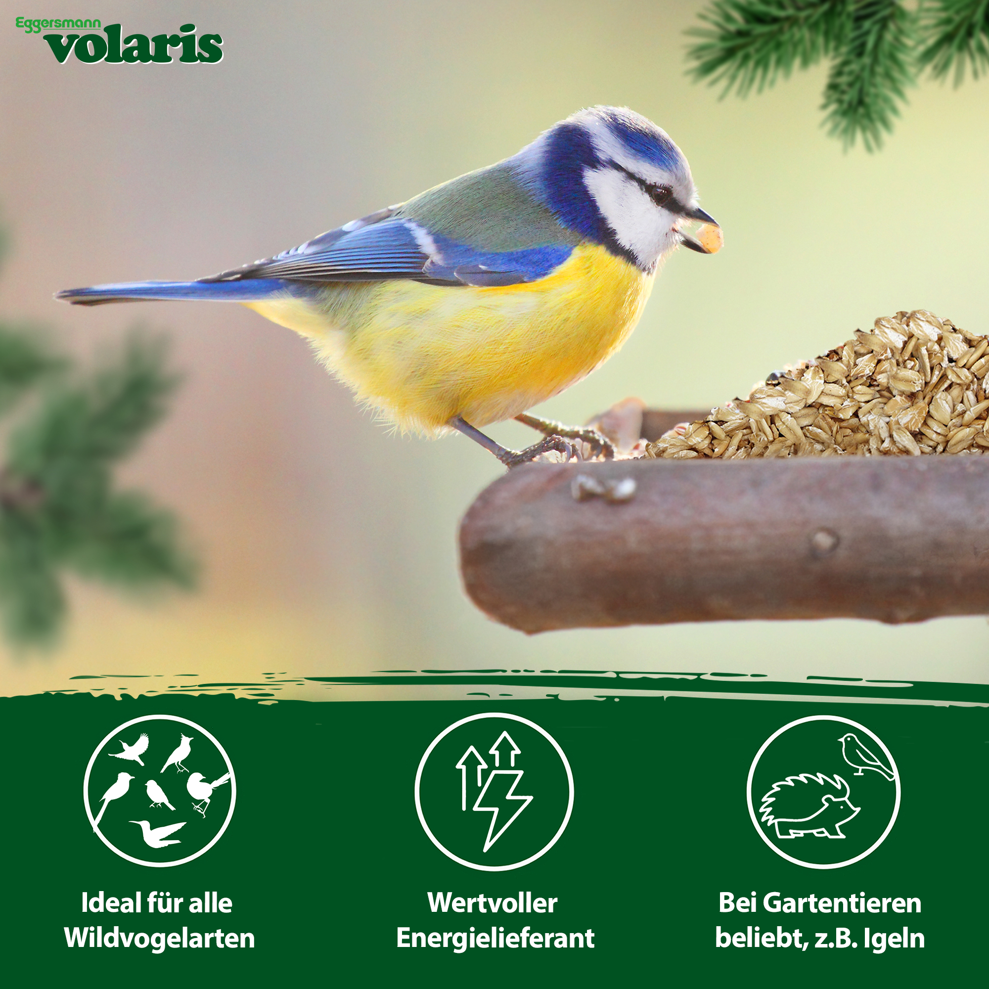 ,"Empfehlung für Wildvögel: Unsere Haferflocken sind für die ganzjährige Fütterung geeignet! Wenn Sie das Futter in Vogelhäusern oder Futterspendern anbieten, reinigen Sie diese regelmäßig mit heißem Wasser. Auf diese Weise minimieren Sie die Übertragung und Ausbreitung von Krankheitserregern. Achten Sie darauf, dass das Futter auch bei starkem Wind, Schnee und Regen nicht durchnässt werden kann, da es sonst verdirbt oder vereist und die Vögel es dann nicht mehr fressen.