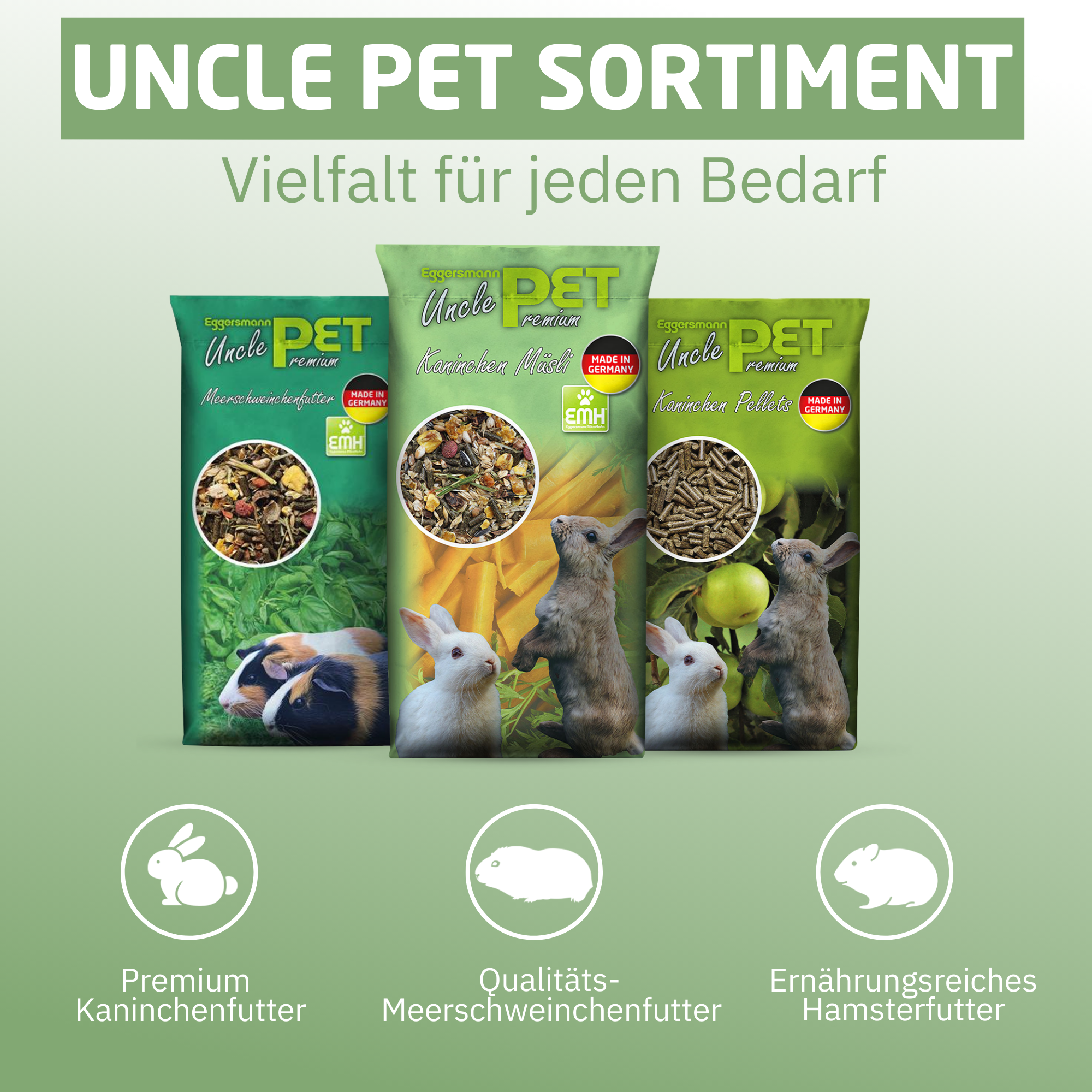 Our Uncle Pet Premium Rabbit Muesli is an appetising supplementary feed for all rabbit and dwarf rabbit breeds. With all the natural goodness of fermented herbs and carrots, it can help to strengthen your rabbit's immune system. At the same time, it provides many essential plant-based nutrients. Its coarse structure with long fibres encourages chewing, which helps to support correct dental attrition. Thanks to the addition of our Eggersmann Micro-Herbs, a fermented plant extract made from a variety of wild, medicinal and aromatic herbs, this muesli is extremely easy to digest, and therefore ideal for feeding rabbits with recurring intestinal problems.