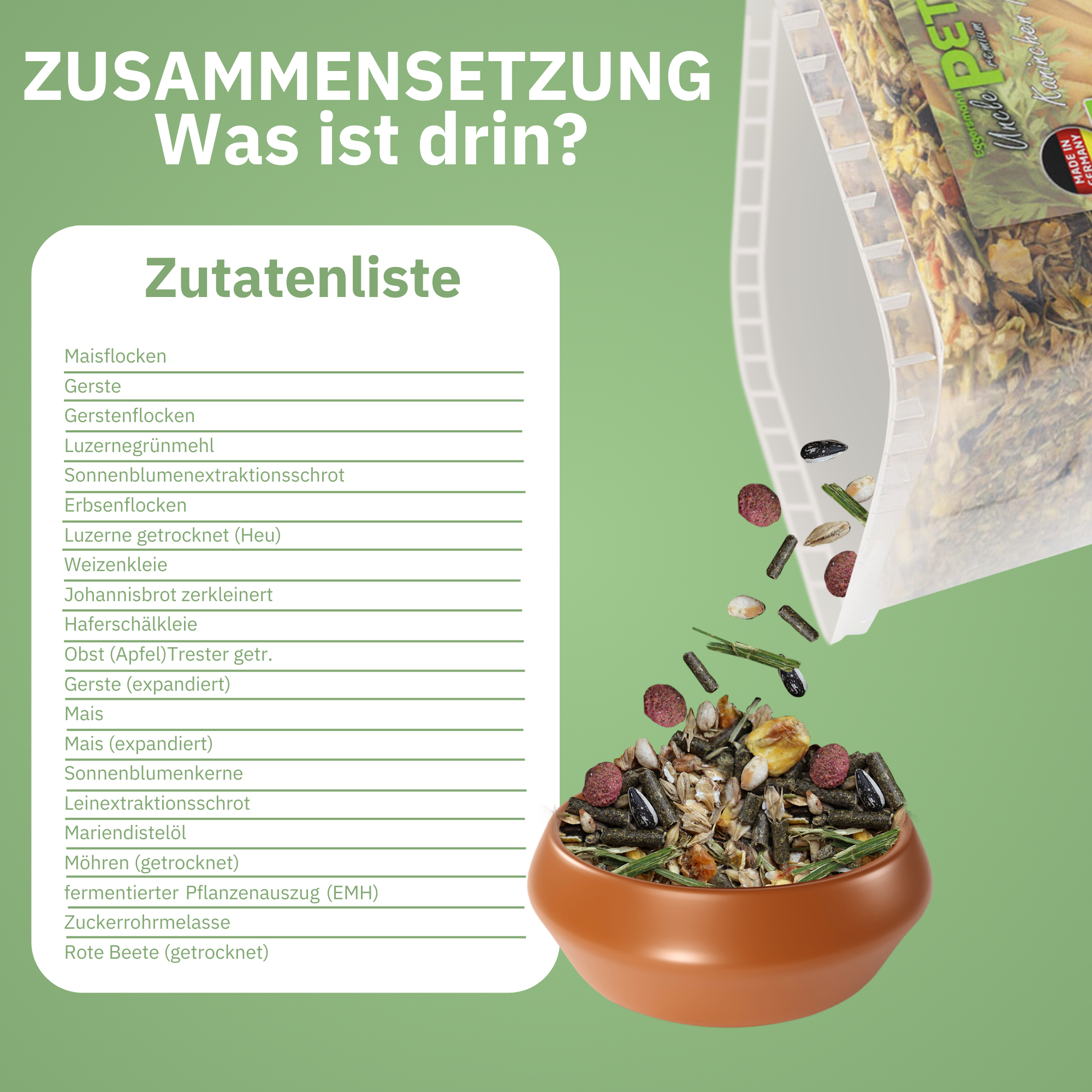 Another special feature of Eggersmann pet food is the addition of the proven Eggersmann MicroHerbs (EMH). This herbal extract fermented by microorganisms supports a balanced intestinal flora and promotes good nutrient digestibility - also in rabbits and rodents. We are therefore proud to offer you this valuable extra in our muesli mixes for the rabbit food, guinea pig food and hamster food ranges.