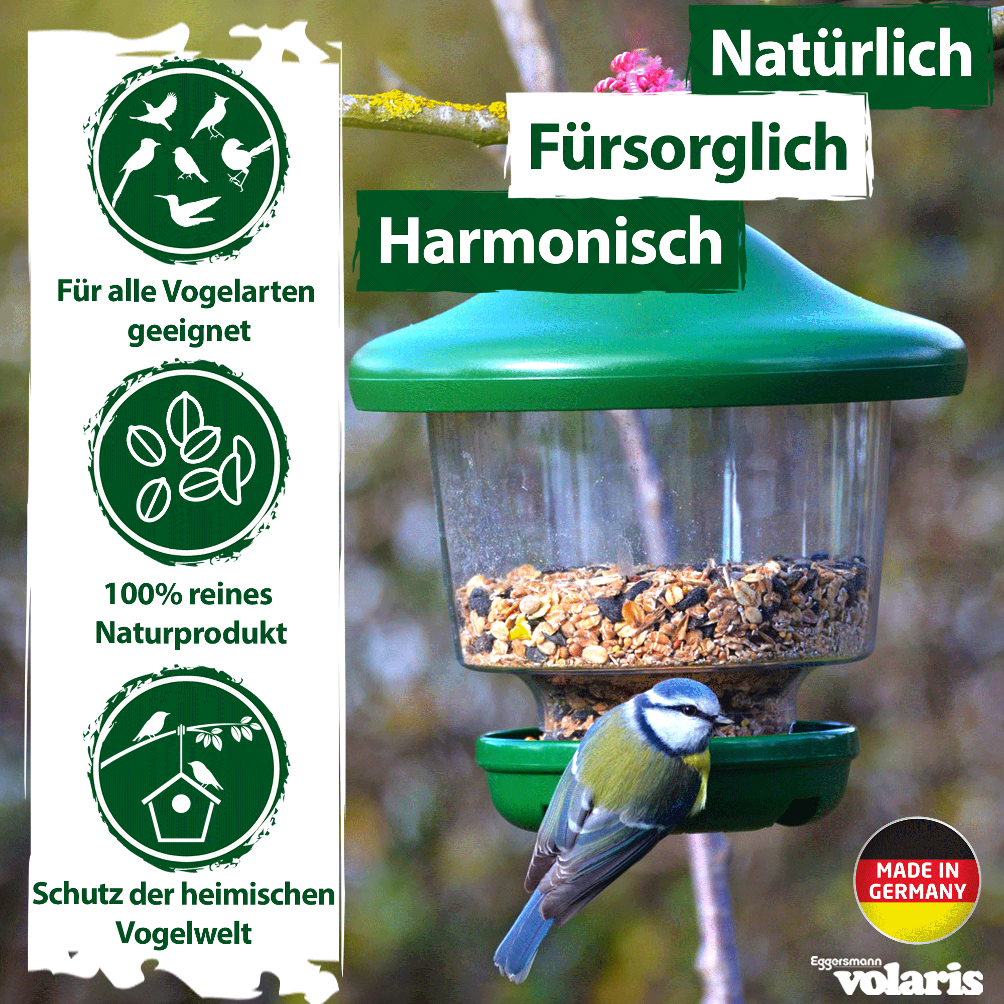 The Eggersmann volaris range now extends from the classic fat feed and scatter feed to fat Balls and muesli or nut bars. Due to the love of bird watching of each of our employees, we can prove the good acceptance of our volaris products with numerous tastings by a wide variety of wild birds.
