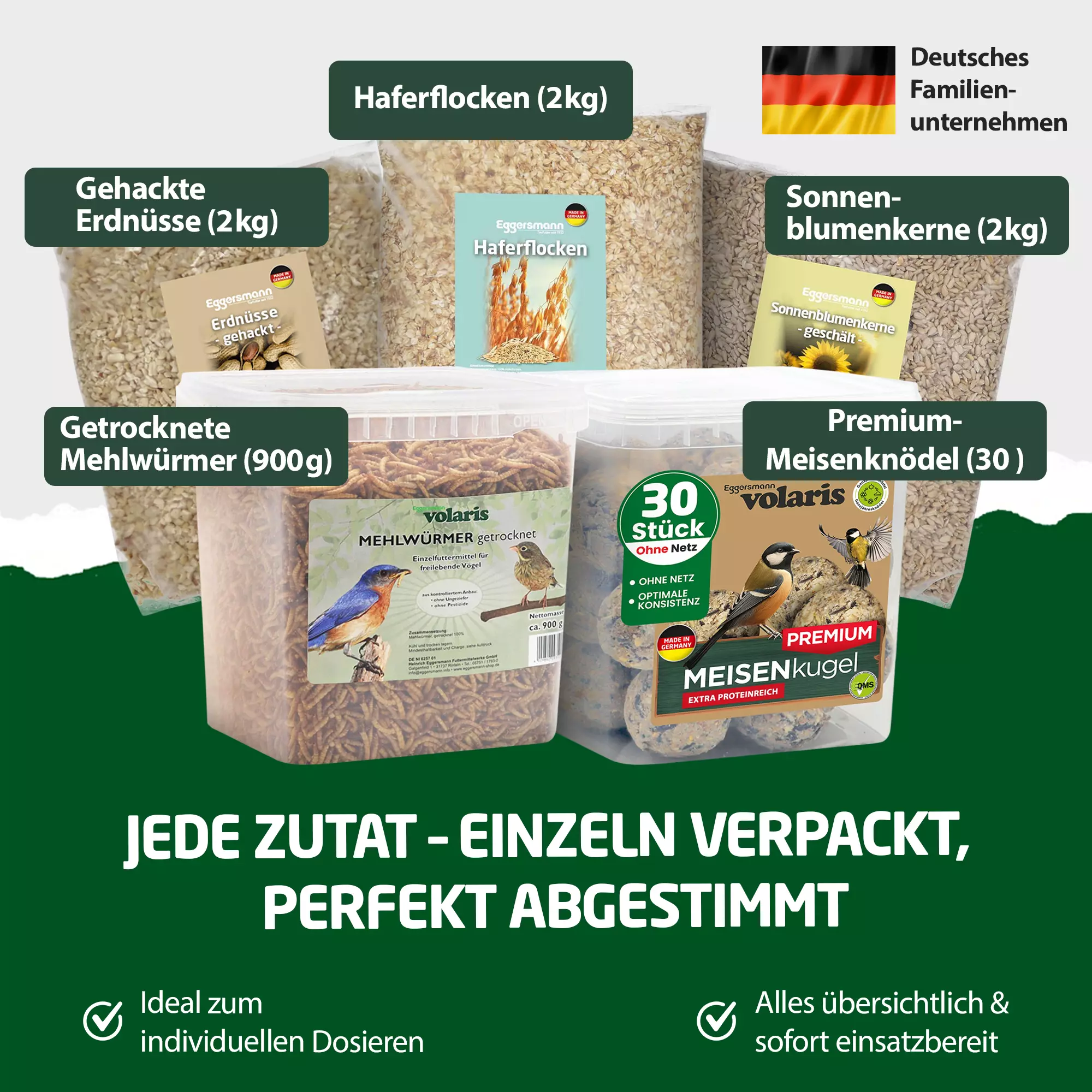 Dieses Bundle vereint das Beste aus zwei Welten: die Individualität der selbst gemischten Einzelfuttermittel mit der bewährten Qualität unserer Premium-Meisenknödel ohne Netz. So schaffen Sie die perfekte Grundlage für eine abwechslungsreiche, artgerechte und nährstoffreiche Fütterung durch alle Jahreszeiten hindurch.