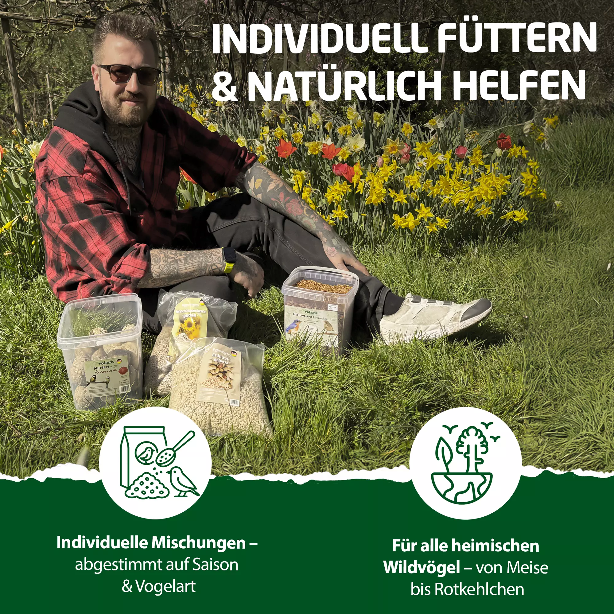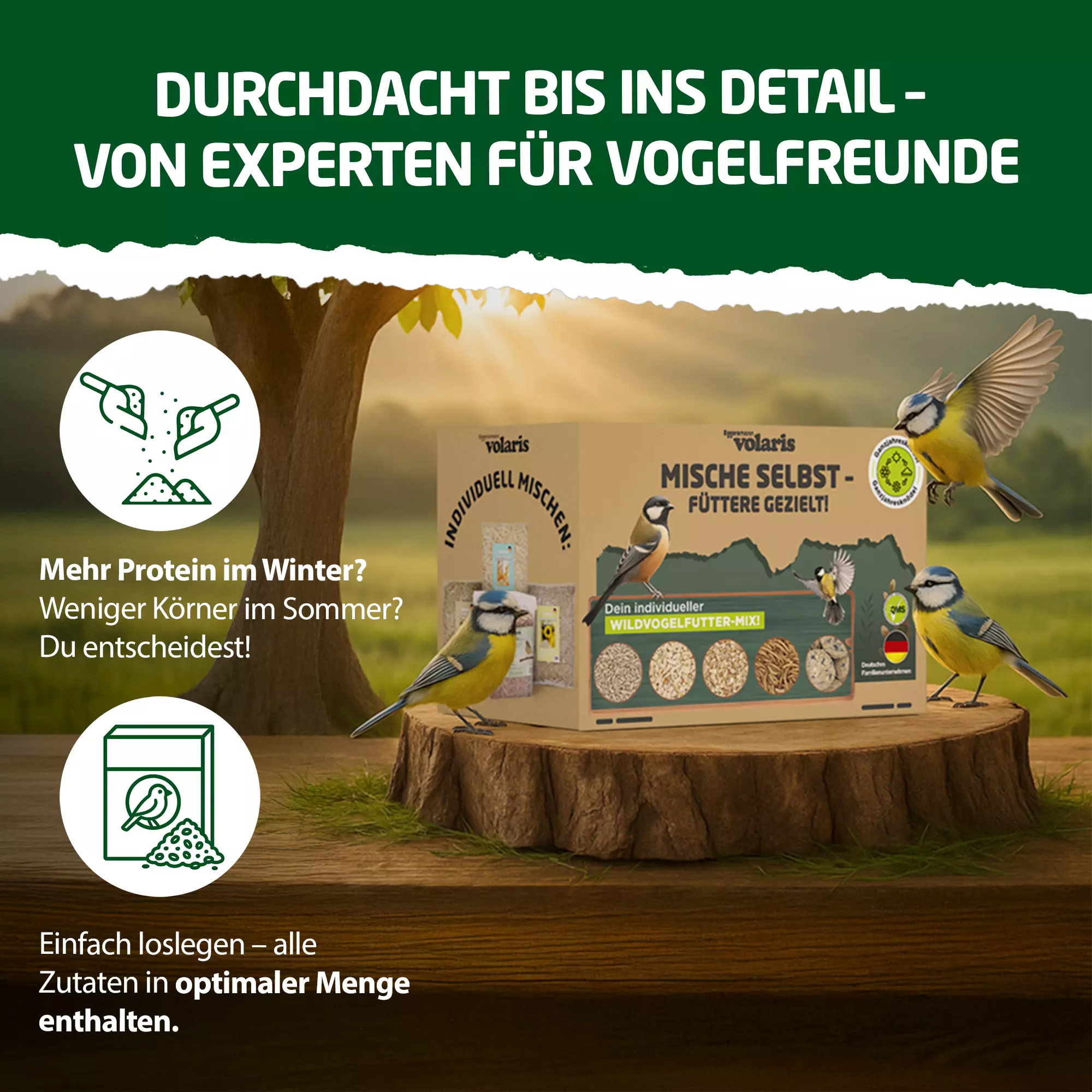 ,,"Unser volaris Selbst Mix Bundle ist für die ganzjährige Fütterung geeignet! Mischen Sie die Zutaten ganz nach Wunsch und Jahreszeit und streuen Sie das Futter an einer geschützten Stelle aus oder bieten Sie es in einem geeigneten Futterspender an. Wenn Sie das Futter in Vogelhäusern oder Futterspendern anbieten, reinigen Sie diese regelmäßig mit heißem Wasser. Auf diese Weise minimieren Sie die Übertragung und Ausbreitung von Krankheitserregern. Achten Sie darauf, dass das Futter auch bei starkem Wind, Schnee und Regen nicht durchnässt werden kann, da es sonst verdirbt oder vereist und die Vögel es dann nicht mehr fressen.