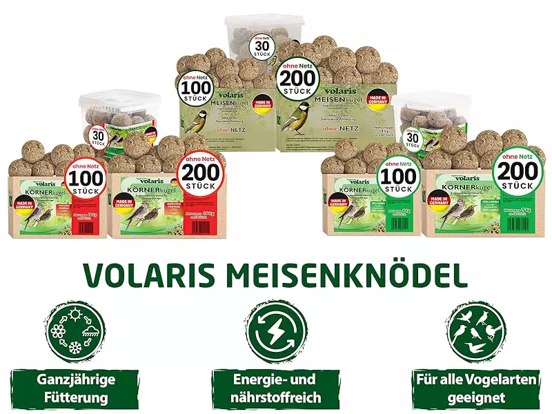 Abgestimmt auf die Ernährungsansprüche von Wildvögeln bieten unsere Meisenknödel eine wertvolle Nahrungsquelle über das ganze Jahr. Durch die vielfältige Zusammensetzung aus hochwertigen Fetten, Getreide und Saaten werden die Vögel mit allen wichtigen Nährstoffen versorgt. Die energiereichen Meisenknödel unterstützen beim Aufbau von Futterreserven und sind für alle Vogelarten geeignet. Neben der schmackhaften Grundsorte sind die Meisenkugeln auch mit Insekten (Protein) und Vollkorn erhältlich.