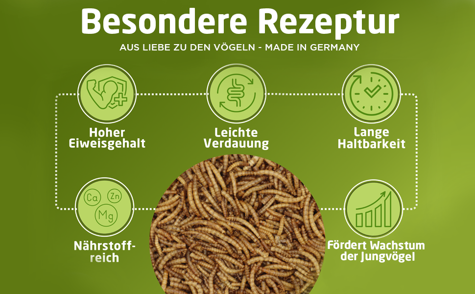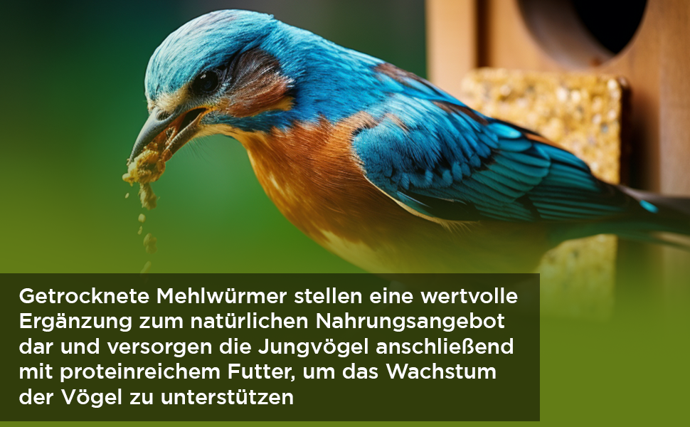 Volaris MEALWORMS dried is the perfect supplementary feeding for insect-eating birds. Dried Mealworms are naturally rich in protein and can be fed all year around. Especially during breeding season, Volaris MEALWORMS dried offers a nutritious complement to the natural food supply of our garden visitors. Also young birds can be well supported in growing due to this high digestible protein source. For robins and other insect-eaters, dried mealworms are a well accepted and feasible alternative to alive feed components.